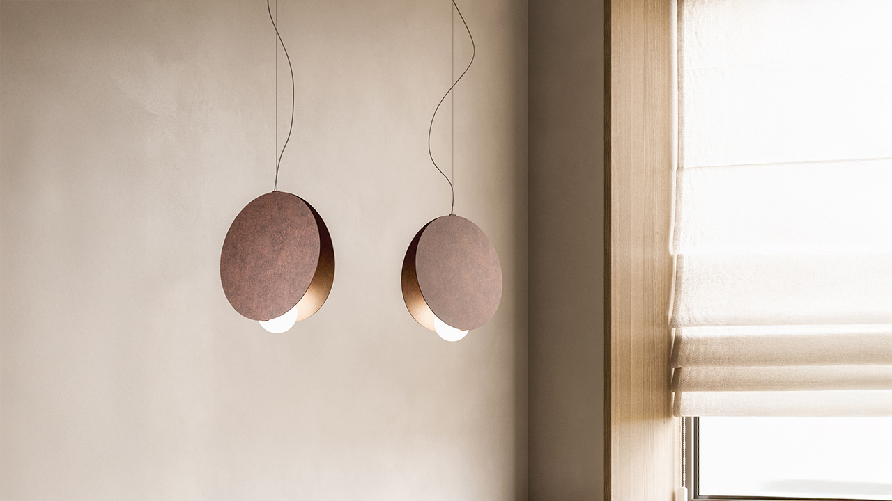 La colección está compuesta por modelos de pared y suspensión para uso interior. Cada luminaria está construida a partir de dos discos metálicos disponibles en acabados blanco, antracita o Corten, que encierran un difusor de vidrio soplado. La fuente de luz es un módulo LED de alta eficiencia con alimentación integrada y regulable mediante corte de fase, lo que permite ajustar la intensidad lumínica según las necesidades del espacio.