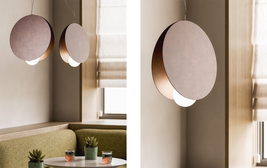 La forma de la luminaria surge de una progresión geométrica de la circunferencia: primero como superficie bidimensional —el círculo—, y luego como volumen tridimensional —la esfera—. La interacción entre estas dos entidades geométricas da lugar a una estructura formal que sugiere una cápsula envolvente que protege una fuente de luz central.