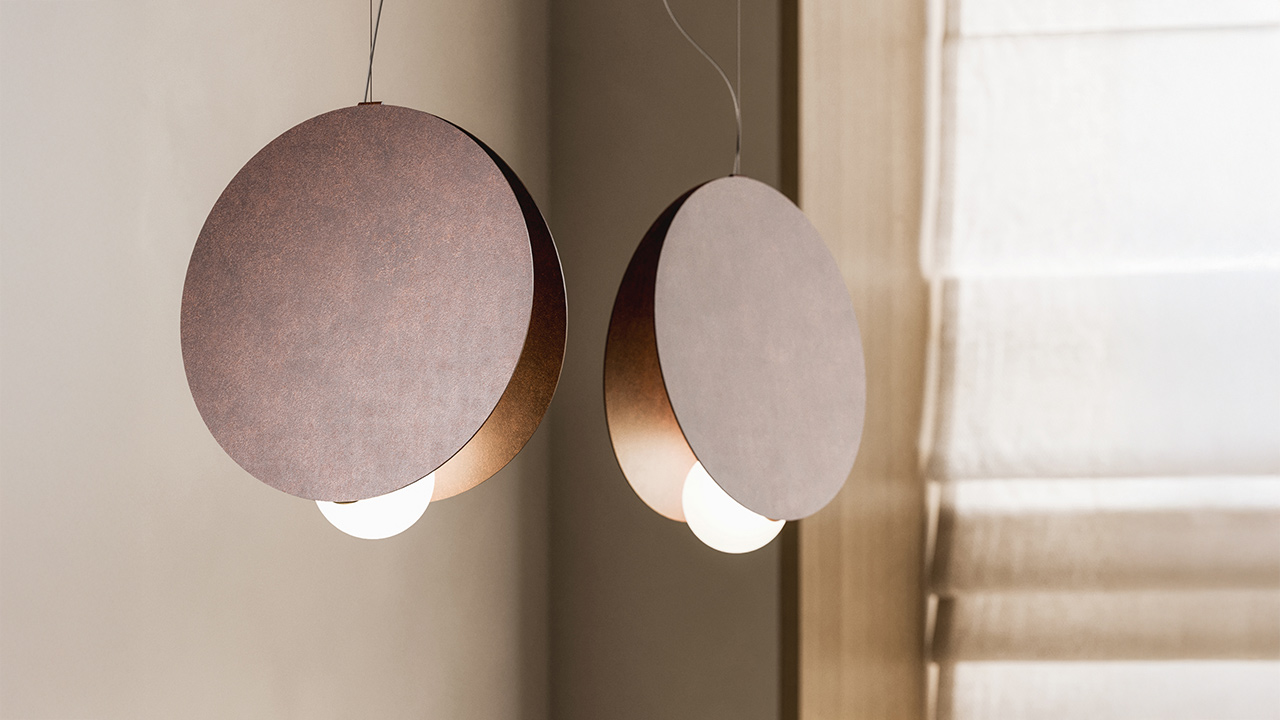 La colección está compuesta por modelos de pared y suspensión para uso interior. Cada luminaria está construida a partir de dos discos metálicos disponibles en acabados blanco, antracita o Corten, que encierran un difusor de vidrio soplado. La fuente de luz es un módulo LED de alta eficiencia con alimentación integrada y regulable mediante corte de fase, lo que permite ajustar la intensidad lumínica según las necesidades del espacio.