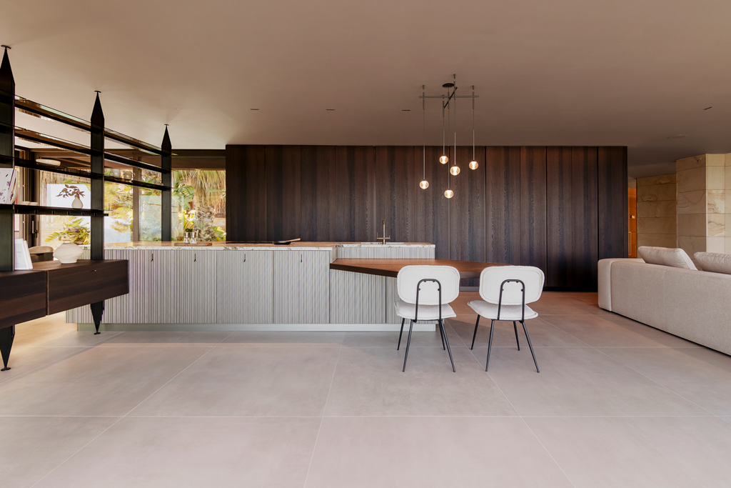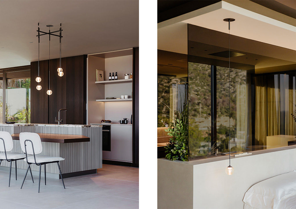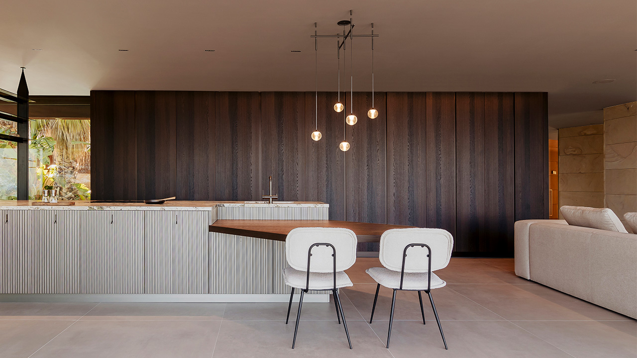 En el living, Casals opta por una instalación compuesta por cinco esferas suspendidas a distintas alturas, pertenecientes a la colección Algorithm. Esta configuración, lejos de imponer un gesto visual dominante, busca el equilibrio entre el carácter escultórico de la luminaria y la contundencia de los volúmenes adyacentes, como los elementos de la cocina contigua.