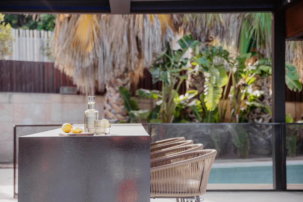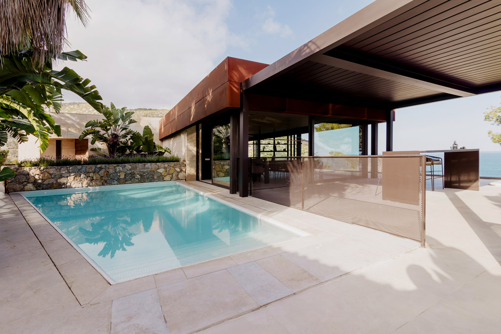 El proyecto de interiorismo, que abarca la planta principal y el área exterior de la vivienda, responde a una lógica de integración total con la arquitectura existente. El lenguaje horizontal de las fachadas y el uso extensivo de piedra natural –presente tanto en el exterior como en los paramentos interiores– condicionan la elección de texturas, colores y soluciones lumínicas.