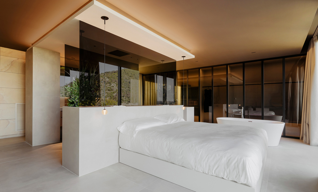 Para el dormitorio principal, el enfoque cambia. La suite, articulada en torno a un volumen central que organiza las distintas funciones, incorpora dos unidades individuales de Algorithm, suspendidas a ambos lados de la cama.