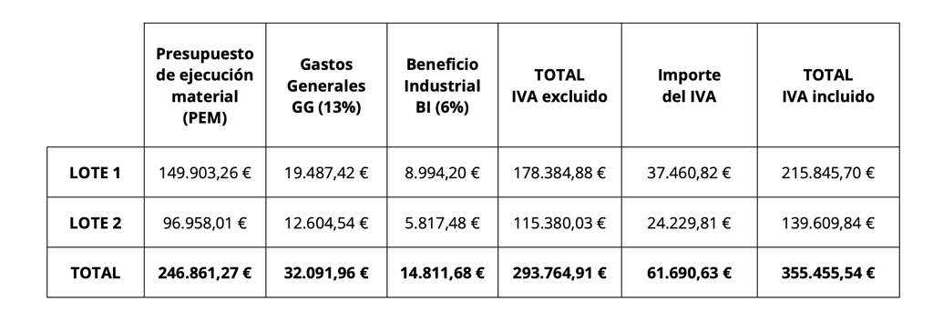 En la siguiente tabla puede ver como se distribuye el presupuesto total de la actuación para ambos lotes: