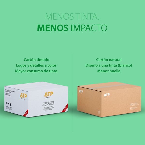 Con motivo del Día Mundial del Medioambiente, celebrado el pasado 5 de junio, ATP Iluminación dio a conocer su nuevo embalaje ecológico: una caja fabricada en cartón natural sin tratar, impresa únicamente con tinta blanca. Esta medida, enmarcada en una estrategia de ecodiseño, tiene como objetivo principal reducir al mínimo la huella ambiental asociada a la fabricación y envío de cada producto.