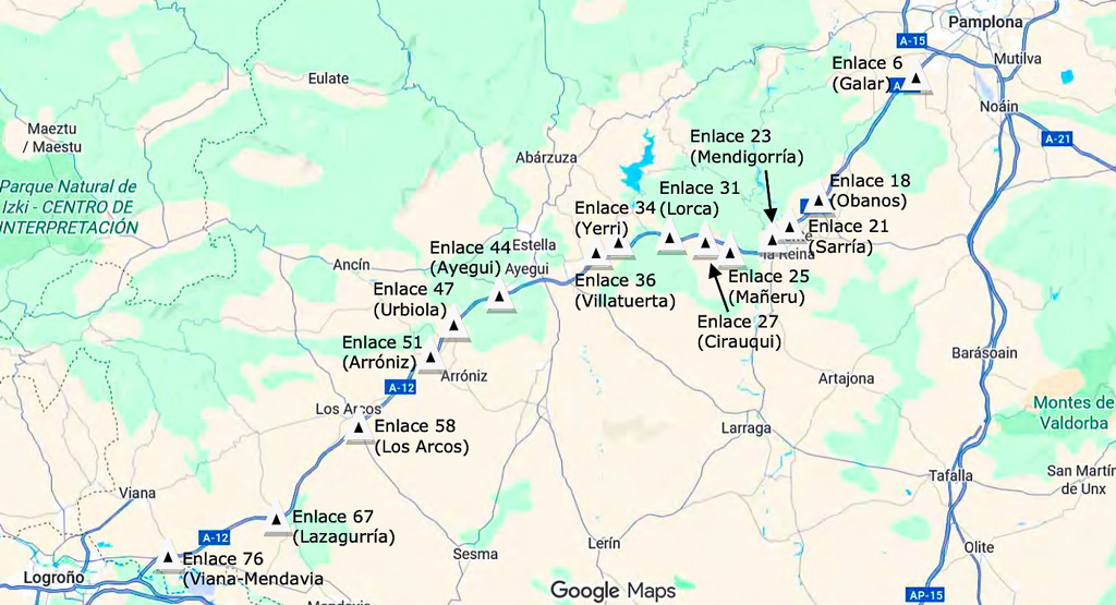 La intervención se desarrollará, por tanto, en 15 enlaces de la autovía A-12, distribuidos desde el p.k. 6 en Galar hasta el p.k. 76 en Viana-Mendavia, cubriendo así buena parte del corredor que articula la conexión entre Navarra y el Alto Valle del Ebro. Estos enlaces, con una interdistancia media de 3,5 kilómetros, desempeñan un papel clave en la accesibilidad a la infraestructura y en la conexión con los núcleos urbanos del entorno.