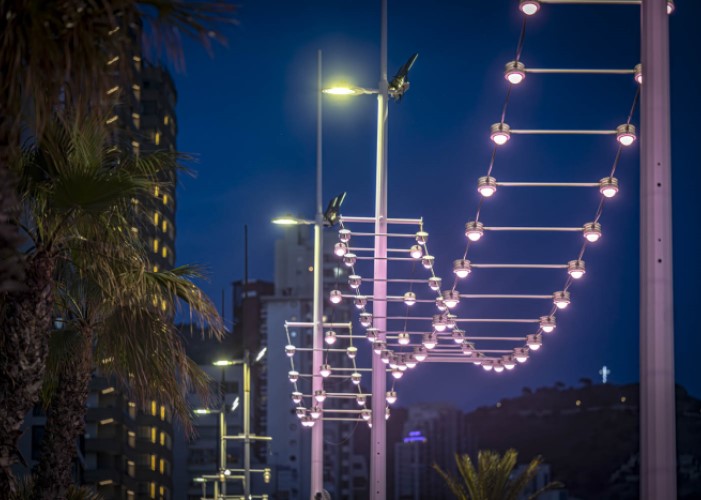 - Potenciar su iconicidad mundial: Benidorm recibe cada año millones de turistas y visitantes de todo el mundo, atraídos por su privilegiado clima, la amplitud y orientación de sus playas y su variada oferta cultural y de ocio. La catenaria del paseo marítimo, un reconocido icono de alumbrado público, es el auténtico corazón de la ciudad.