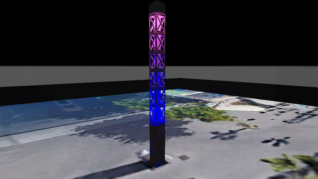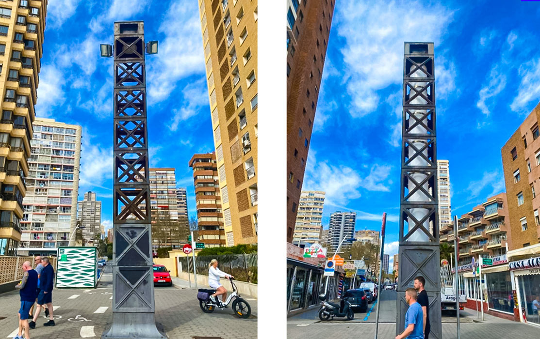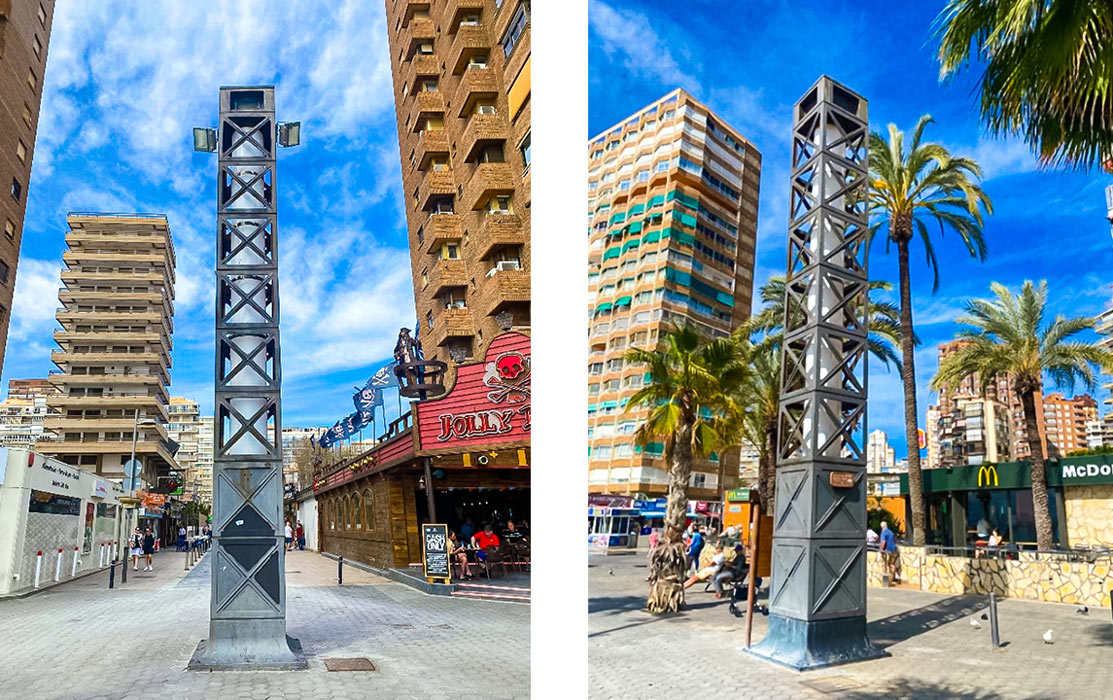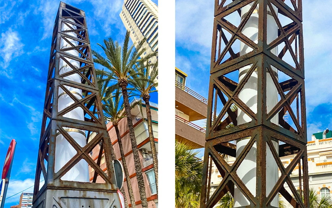 Su diseño, compuesto por una estructura metálica cuadrada de 9,5 metros de altura y un cilindro difusor interior de metacrilato iluminado desde dentro, convierte a cada unidad en un hito visual que marca accesos y cruces del paseo. Actualmente, de las 22 unidades instaladas, 18 se encuentran a lo largo del Paseo de Levante y 4 en el cruce de la avenida Europa con la primera línea de playa.