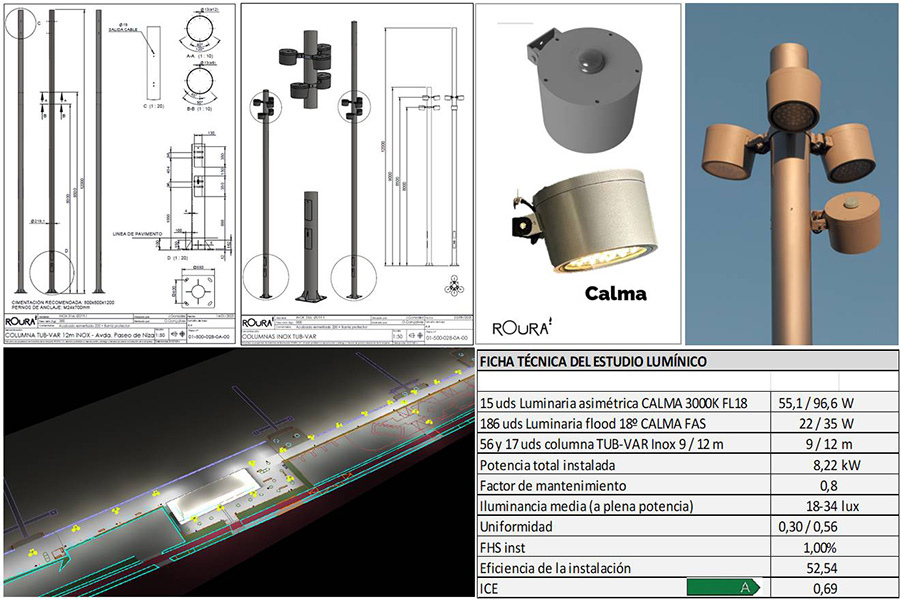 Con todo ello, desde Industrias de Iluminación Roura, se estudió, diseño e industrializarnos unos soportes de alumbrado conformados por tubo cilíndrico de acero inoxidable AISI316L al que, adicionalmente, se le dio un tratamiento superficial tipo barniz para evitar la corrosión superficial de las partículas metálicas que se adhieren a las superficies. Combinaciones lineales de soportes de 9 y 12 metros de altura complementaban todo el proyecto interviniendo muy discretamente en la conformación en sección del paseo. La columnas de 12 metros ofrecen la posibilidad de soportar otras instalaciones necesarias, como son cámaras, megafonía o sistemas de telecomunicación.