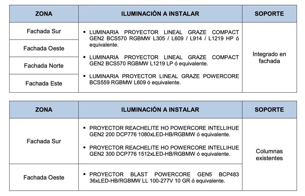 Con el fin de minimizar el impacto visual y físico sobre el bien patrimonial, las luminarias lineales RGBMW previstas presentan dimensiones reducidas (aprox. 45×42 mm y longitudes de entre 306 y 1.219 mm, según modelo) y se instalarán principalmente en los alféizares de las ventanas, así como en columnas y torreones. Para asegurar su mimetización con el edificio, se utilizarán lames de enmascaramiento y soportes regulables pintados del mismo color que la fachada, incluyendo el cableado y las estructuras de fijación en cubierta.