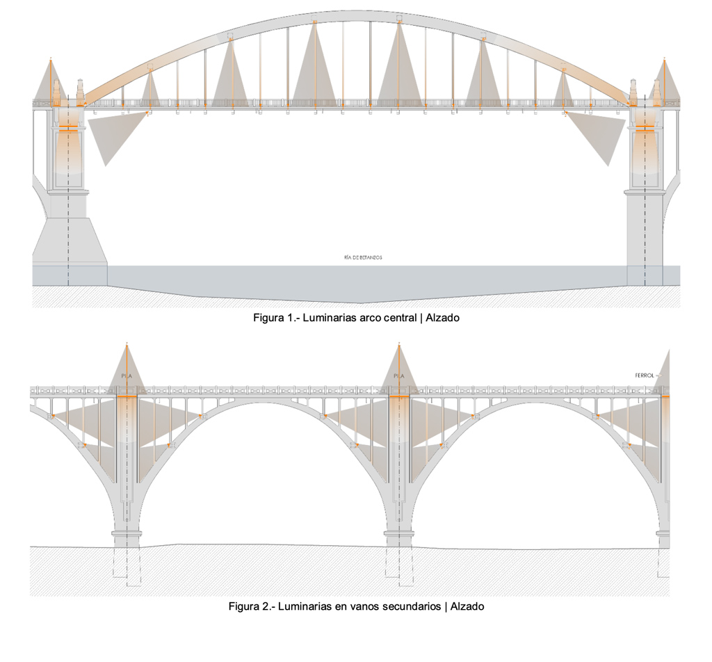 En concreto, se propone una nueva instalación de iluminación lumínica compuesta por 194 proyectores y bañadores LED distribuidos por los elementos de la estructura (pilares, nervios, arco y colgantes), y 35 luminarias LED para el alumbrado vial.