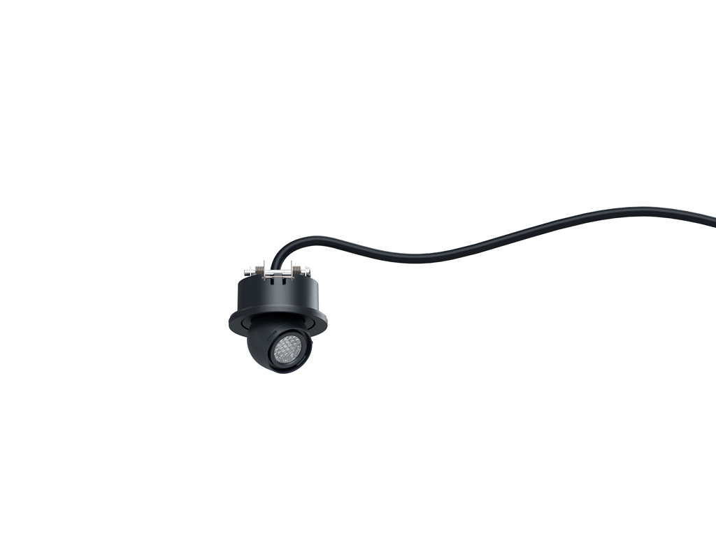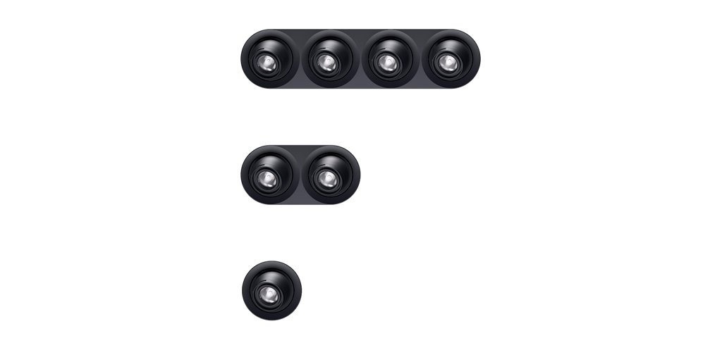 La gama Axis de ERCO incluye una variedad de proyectores empotrables en miniatura, con un diámetro de emisión de luz de apenas 17 mm. Estos proyectores están disponibles en varias configuraciones, ya sea individualmente en marcos empotrados para un único proyector o en conjuntos de dos o cuatro, todos requiriendo una profundidad máxima de empotramiento de 28 mm. Cada cabezal puede inclinarse hasta 140° y girar 360° independientemente, permitiendo un ajuste preciso hacia objetos o superficies específicas. Además, las ópticas de lente de alta eficiencia se ofrecen en configuraciones de luz spot (17°), flood (32°) y wide flood (47°), que pueden intercambiarse fácilmente sin herramientas.