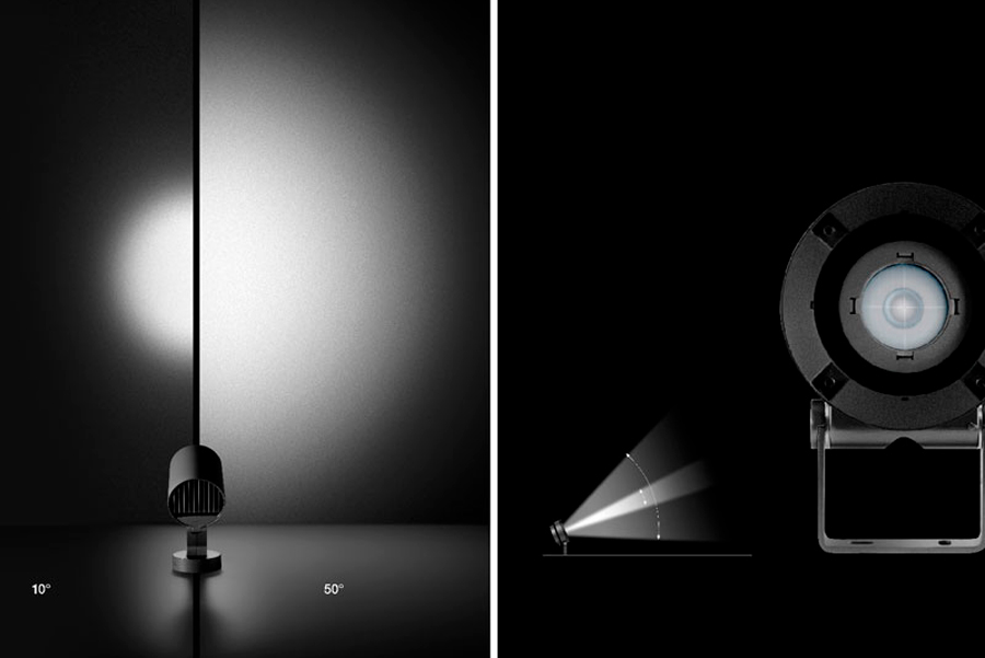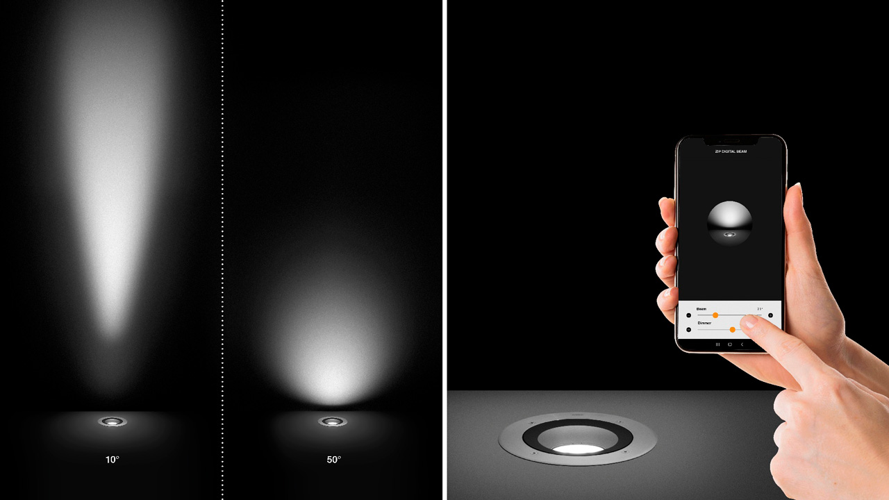 Las luminarias diseñadas con la innovadora tecnología Digital Beam tienen ópticas variables, donde el haz puede ser gestionado a través de una entrada digital. Con un dispositivo móvil o modernos sistemas de control, es posible modificar dinámicamente el ángulo del cono de luz desde un haz puntual hasta una inundación con una acción simple. Esto significa poder seleccionar cualquier grado de 10° a 50° y cualquier nivel intermedio, adaptando el haz en tiempo real al sujeto que se va a iluminar. Todo esto se hace electrónicamente.