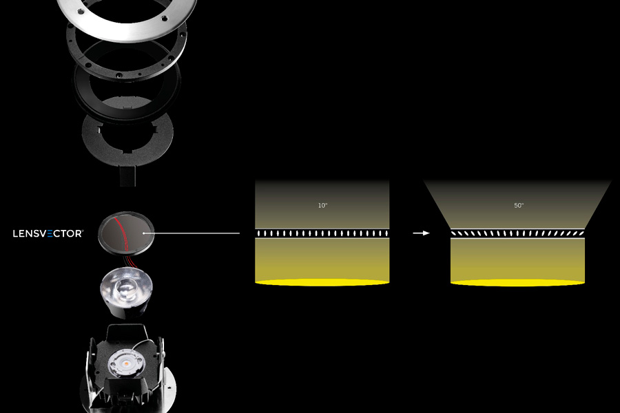 Digital Beam utiliza una lente de cristal líquido (LensVector™) unida directamente a la unidad óptica. Un impulso eléctrico estimula los cristales líquidos en su interior, orientándolos gradualmente. Las moléculas, activadas por el campo eléctrico, se polarizan para permitir el paso de la luz a un ángulo determinado. Una placa electrónica especialmente diseñada recibe y transmite el voltaje necesario para controlar el LED y el LensVector™. Este enfoque elimina la necesidad de reemplazar lentes y reflectores para crear una nueva escena. En cambio, se puede configurar electrónicamente tanto la cantidad como el haz de luz.