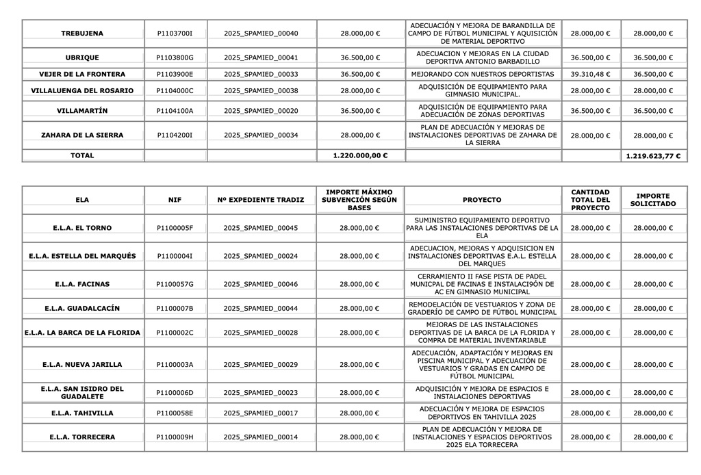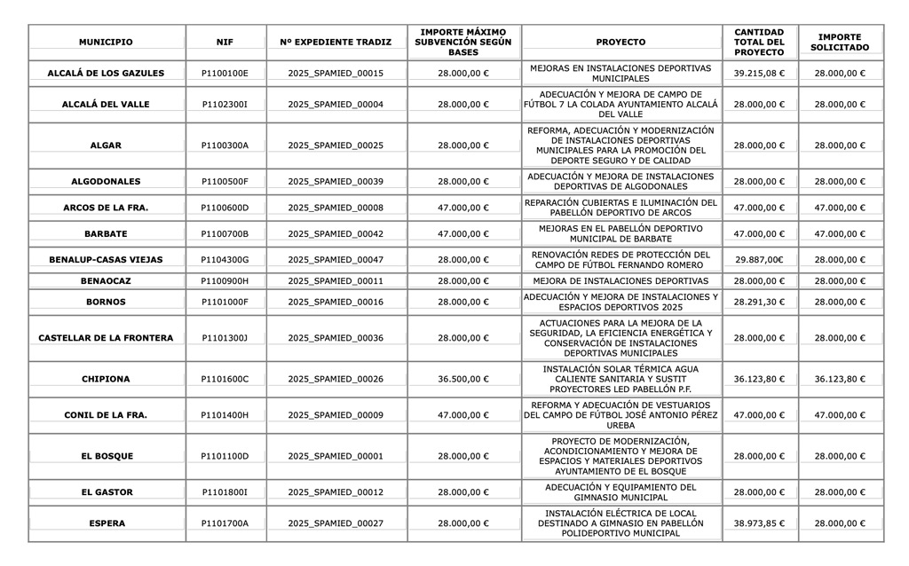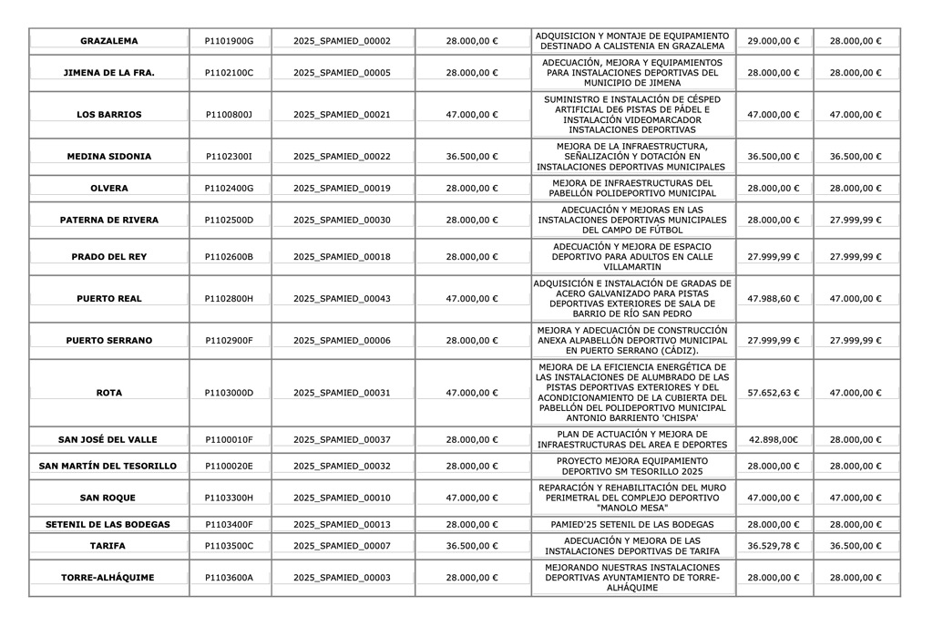 La Diputación de Cádiz ha aprobado la financiación de un total de 47 proyectos municipales y de entidades locales autónomas en el marco del Plan de Adecuación y Mejora de Instalaciones y Espacios Deportivos (PAMIED). La inversión, que asciende a 1.499.623,77 euros, se destinará a actuaciones que abarcan desde la modernización de sistemas de iluminación y la incorporación de energías renovables hasta la mejora de la accesibilidad, la reparación de infraestructuras y la adquisición de equipamiento deportivo.