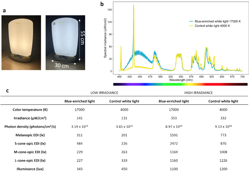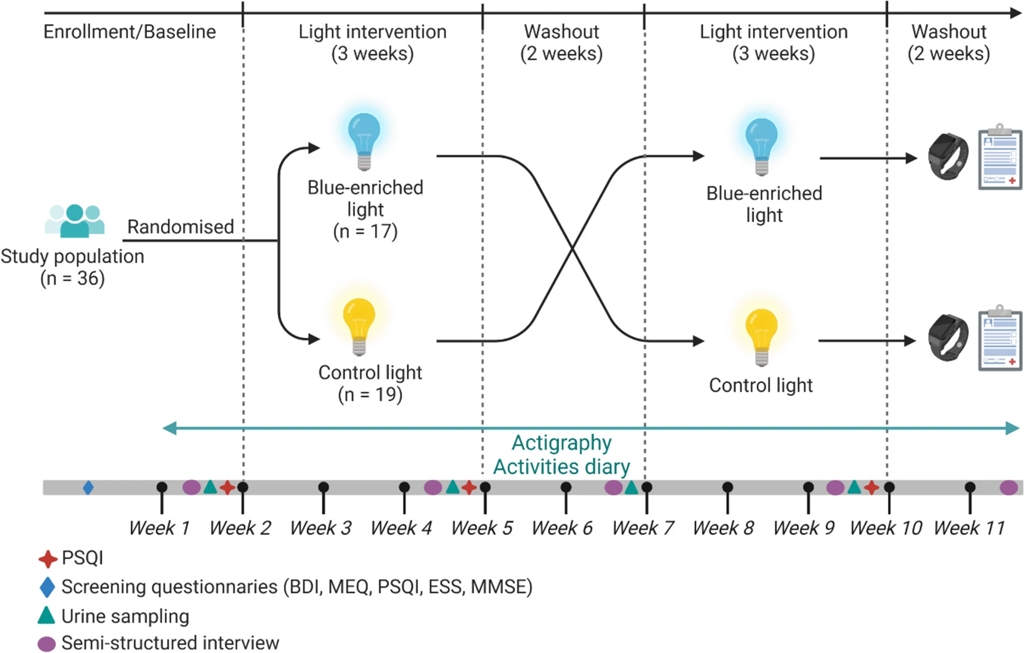 La luz, especialmente la luz azul de onda corta (420 – 480 nm), influye significativamente en la fisiología humana según su tiempo, intensidad, duración y longitud de onda, siendo más efectiva por la mañana para adelantar los ritmos circadianos y por la noche para retrasarlos. Estudios anteriores han demostrado que la luz azul puede incrementar la actividad diurna, reducir el insomnio y fortalecer los ritmos de actividad en reposo en personas mayores, aunque estos estudios a menudo se limitaron a participantes con deterioro cognitivo leve o demencia en entornos institucionales controlados.