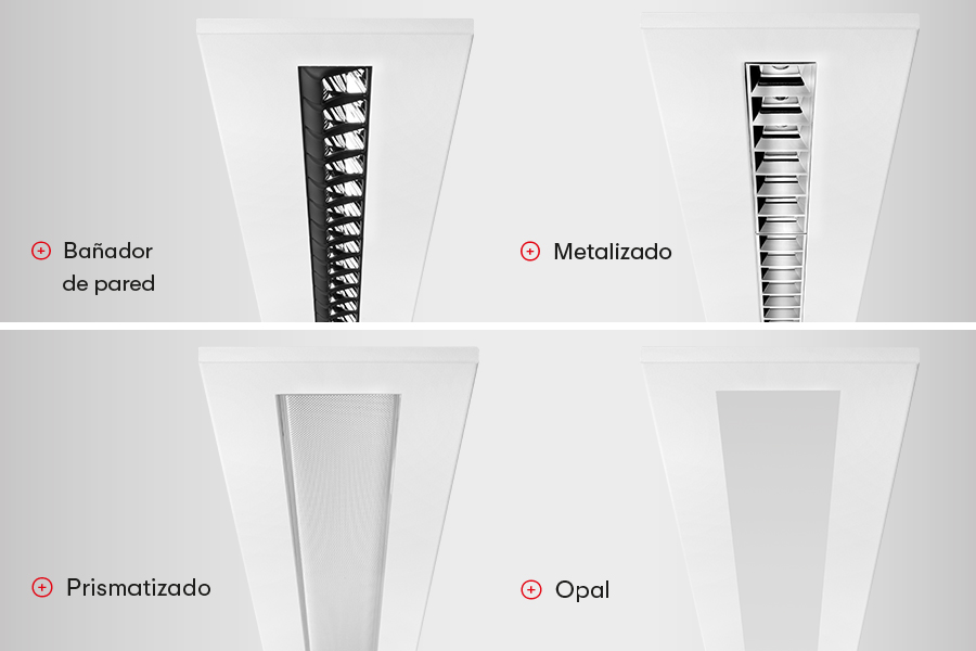 - Óptica bañadora de pared, ideal para resaltar superficies verticales, especialmente útil en instalaciones educativas.