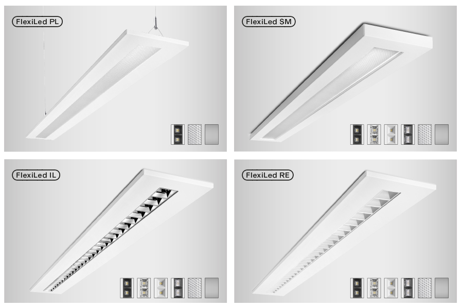 La distribución adecuada de la luz es clave en los entornos laborales, y en este aspecto FLEXILED ofrece soluciones ópticas ideales para cada aplicación y espacio. Está disponible con: