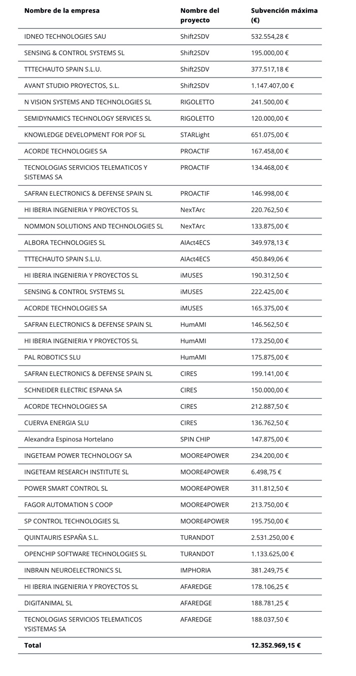 En concreto, los 36 proyectos van a recibir 12,3 M€ por parte de España, 13,1 M€ por parte de la Chips JU y en torno a 20 M€ de las aportaciones de las empresas adjudicatarias.