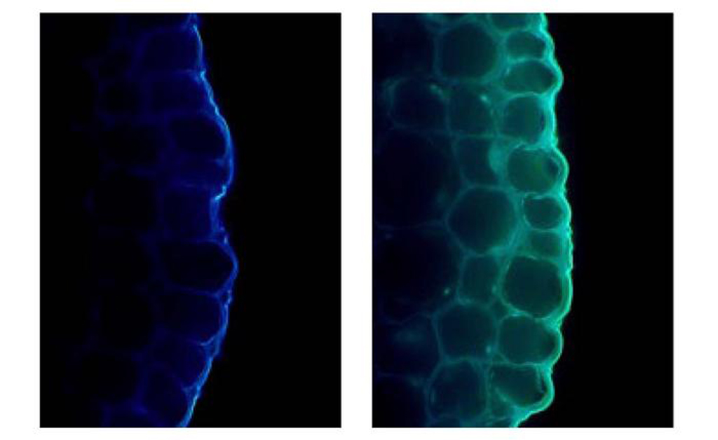 La clave bioquímica del fenómeno aparece al analizar los tejidos mediante microscopía de fluorescencia. Los tallos expuestos a la luz muestran una señal asociada a una mayor acumulación de ácido p-cumárico, un compuesto fenólico implicado en el refuerzo de la pared celular. Este tipo de compuestos incrementa la rigidez y cohesión de las células, lo que explica el aumento de la adhesión entre capas.