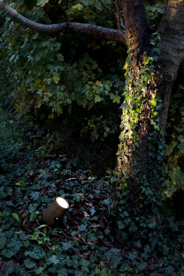 Diseñado para aplicaciones paisajísticas, combina una espiga de anclaje en el terreno con proyectores orientables. Permite el montaje de uno o dos cabezales en diferentes alturas, lo que facilita su integración en vegetación densa o contextos escénicos con requerimientos de proyección específicos.