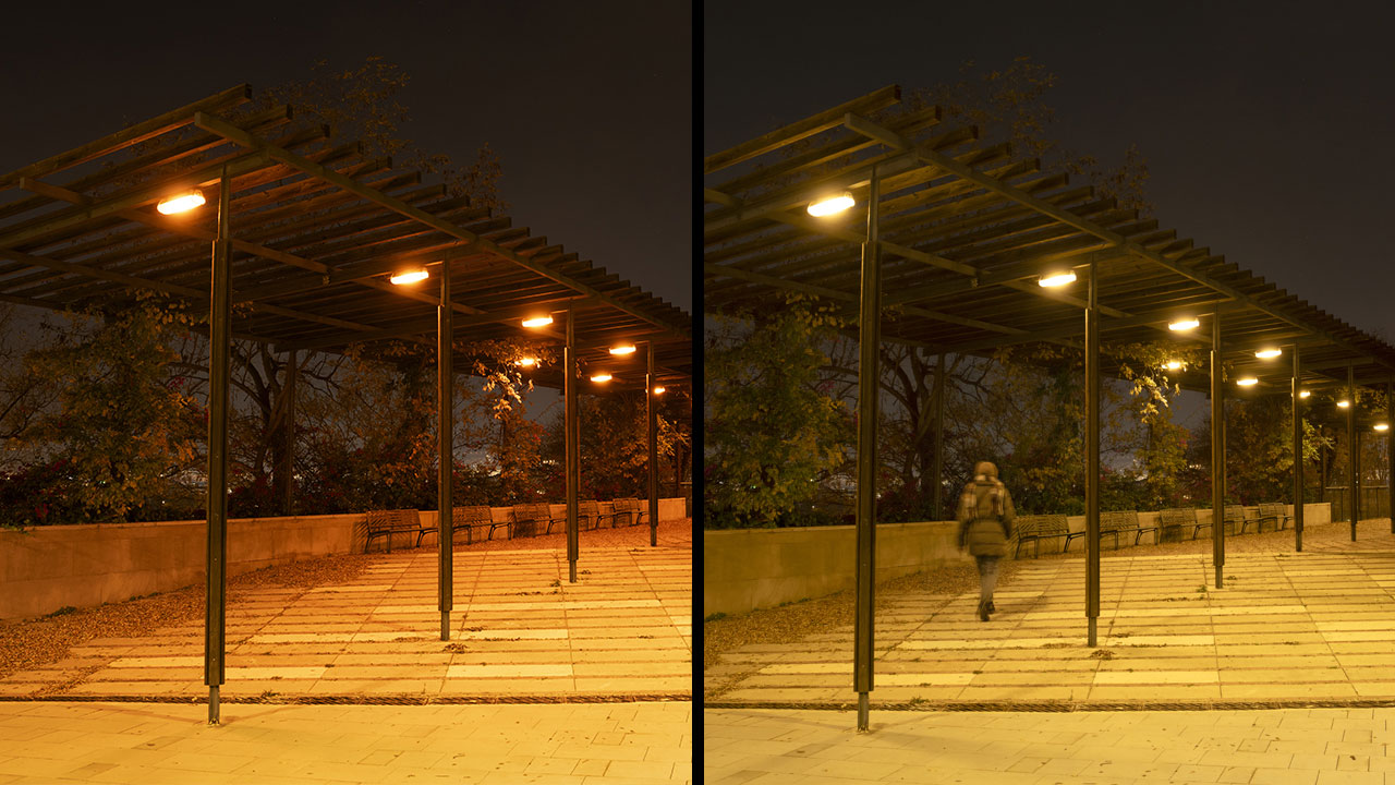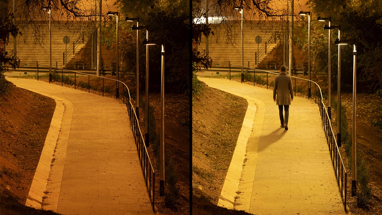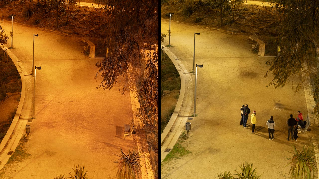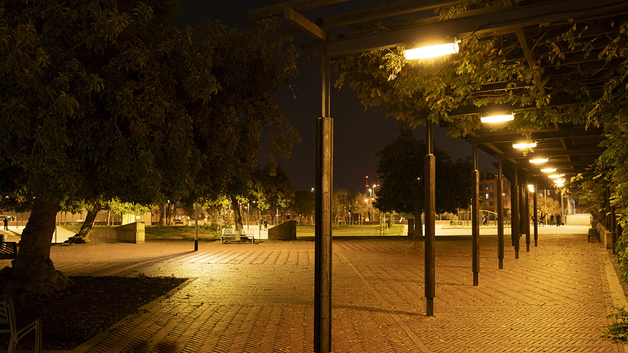 En las zonas con comportamiento adaptativo, el sistema ajusta automáticamente los parámetros lumínicos a partir de la información proporcionada por sensores de presencia. En ausencia de actividad, el alumbrado funciona con niveles reducidos y temperaturas de color cálidas —ámbar en la pérgola y en torno a 2200 K en el resto del parque—, limitando la emisión en el espectro azul y reduciendo el impacto sobre el entorno. Cuando se detecta presencia, el sistema incrementa progresivamente la iluminancia y eleva la temperatura de color hasta 3000 K, mejorando las condiciones de visibilidad sin recurrir a una iluminación permanente sobredimensionada.