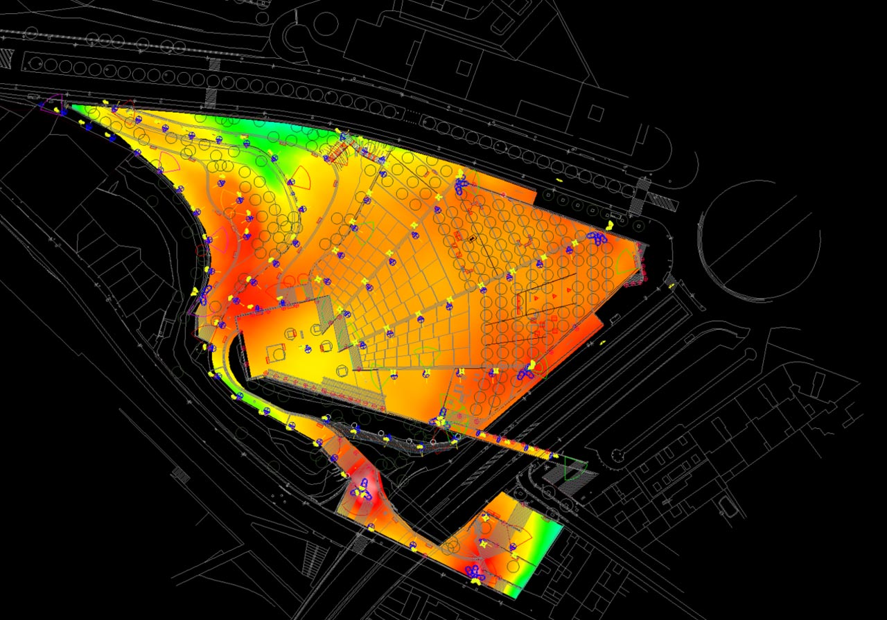 La configuración del sistema parte de un trabajo previo de cálculo lumínico realizado por el equipo especializado de Carandini y orientado a garantizar condiciones adecuadas de visibilidad, uniformidad y confort visual en cada zona del parque. A partir de estos estudios, la zonificación se tradujo en requisitos técnicos concretos, definiendo niveles de iluminación por área y estableciendo transiciones progresivas entre escenas para evitar contrastes bruscos, sobreiluminación y fenómenos de deslumbramiento.