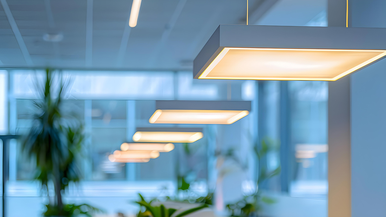 Las soluciones mixtas directo–indirectas se perfilan como las más equilibradas. Luminarias lineales suspendidas, con un reparto aproximado del 80 % hacia abajo y un 20 % hacia arriba, consiguen mantener buenos niveles de luz en el plano de trabajo y, al mismo tiempo, aportar la iluminancia vertical necesaria al ojo. Logran así un balance adecuado entre rendimiento circadiano, consumo moderado y buena percepción por parte de los usuarios.
