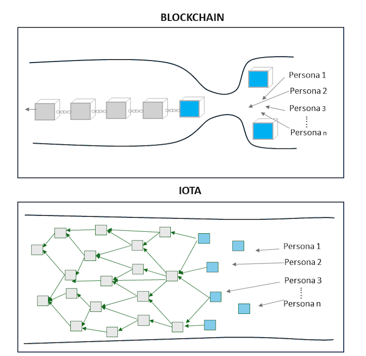 Esto hace que el proceso sea lento y caro, porque requiere mucha energía. IOTA, sin embargo, actúa como una red. Imagine a estas mismas personas accediendo al cine a través de muchas puertas diferentes al mismo tiempo y que, además, cada persona ayuda a otras dos para entrar más rápidamente.