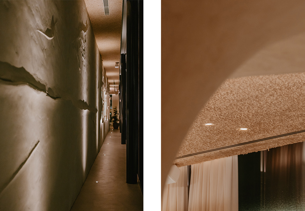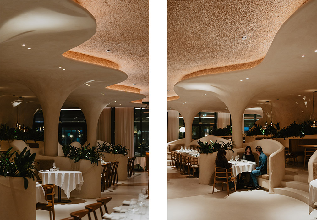 La incorporación de jardineras, dentro de las cuales se han dispuesto proyectores ocultos que pintan con luz contrapicada las bóvedas que recorren el local, y la iluminación decorativa suspendida contribuye a la privacidad de los comedores, mientras que la iluminación focalizada sobre las mesas asegura que cada área tenga la atmósfera adecuada para una experiencia culinaria memorable.