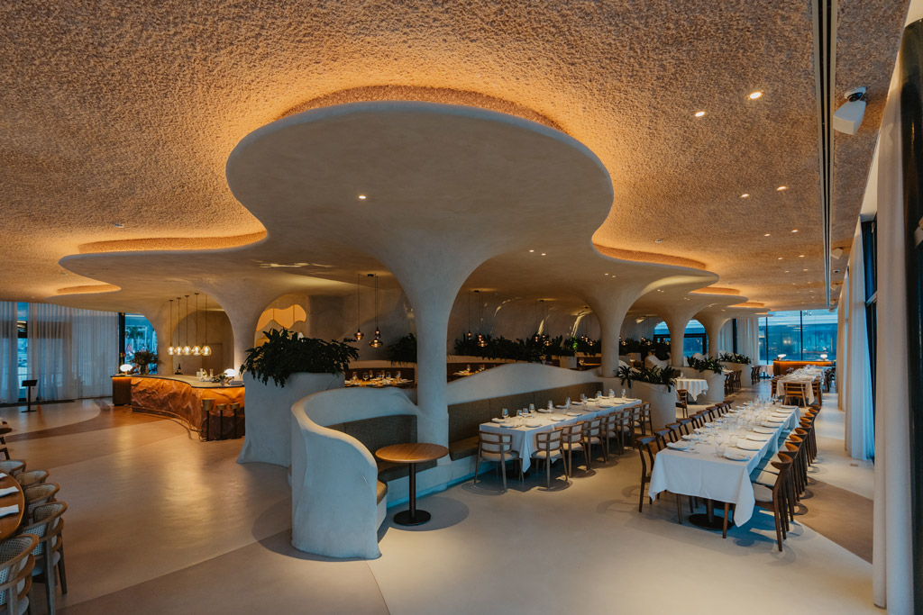 Los paramentos verticales del restaurante están revestidos con mortero de cal proyectado sobre mantas de cañizo, mientras que los techos acústicos se basan en un proyectado de celulosa. Además, el uso de madera de pino radiata en las estructuras ocultas permite aligerar peso y masa en todo el volumen.