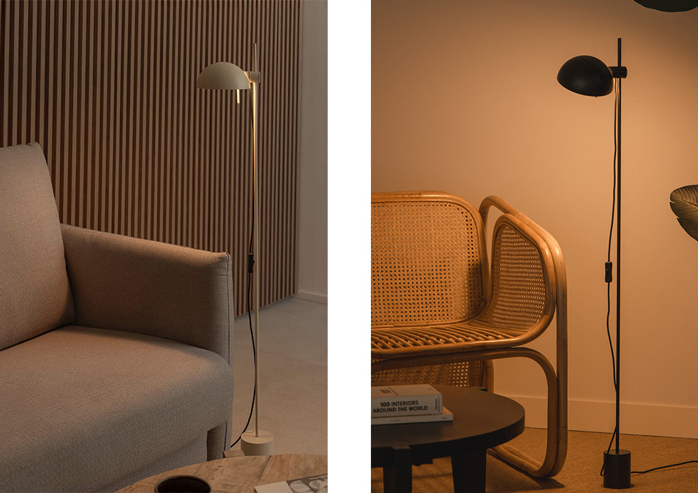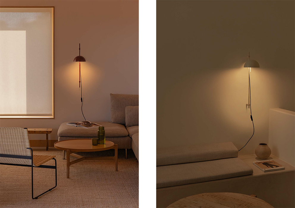 La colección se articula en cuatro versiones tipológicas: lámpara de pie, sobremesa, aplique fijo y aplique en barra. Esta diversificación responde a una lógica de familia coherente: un mismo lenguaje formal y constructivo se adapta a diferentes escalas y ubicaciones, manteniendo una unidad visual.