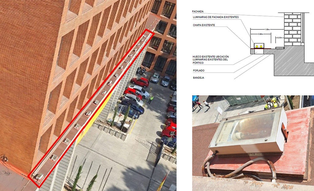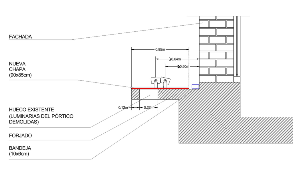 La solución planteada aprovecha las envolventes existentes con el objetivo de mantener inalterado el aspecto visual de la fachada. El hueco actual, cubierto por una chapa estructural, servirá de soporte para la instalación de una caja metálica que alojará dos luminarias de fachada. La disposición, orientación y dimensiones de estos elementos se ajustarán a la configuración definida en el proyecto, garantizando su correcta integración en el conjunto arquitectónico (ver imagen).