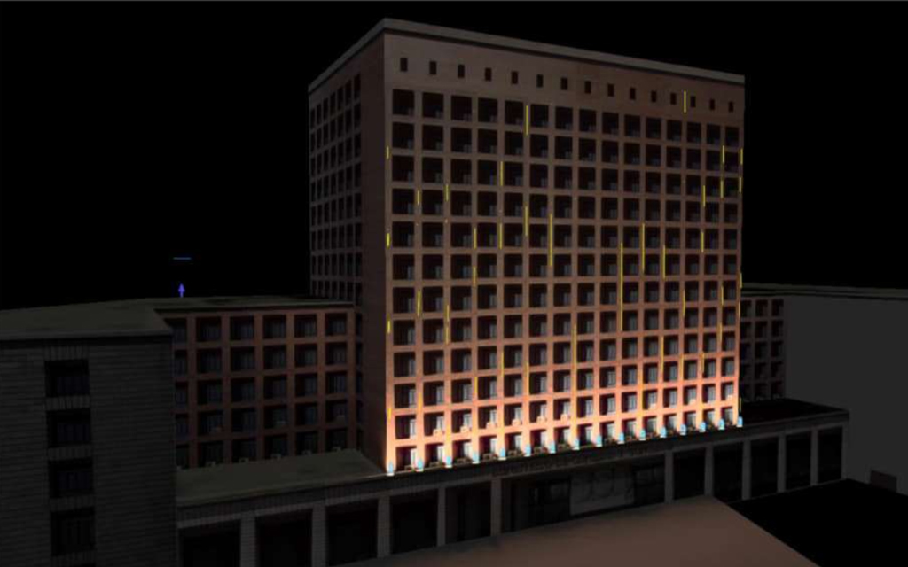 El nuevo diseño plantea una ampliación significativa del sistema. En una primera fase se instalarán 32 luminarias exteriores, distribuidas en dos filas de 16 unidades cada una. Cada luminaria tendrá una potencia de 150 W y utilizará tecnología LED RGBWM, lo que permitirá generar iluminación dinámica en distintos colores.