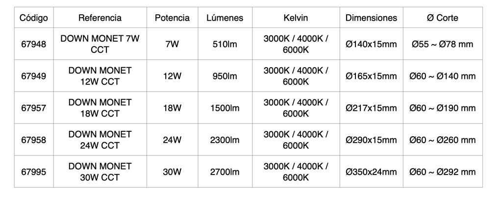 La gama Monet 3CCT cubre un amplio rango de potencias, desde 7W hasta 30W, adaptándose a diferentes necesidades lumínicas y tipologías de proyecto.
