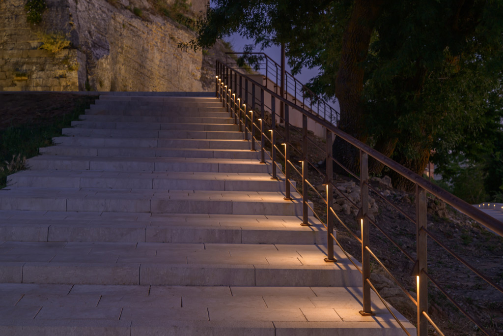 Entre las soluciones desarrolladas destaca el modelo TIKAL, un empotrable compacto para escaleras y pasos diseñado para integrarse visualmente en entornos arquitectónicos de alto valor patrimonial. En el acceso que conecta Viale Nino Savarese con el Museo del Mito, el dispositivo se fijó directamente sobre una barandilla de acero corten, sin necesidad de estructuras adicionales.