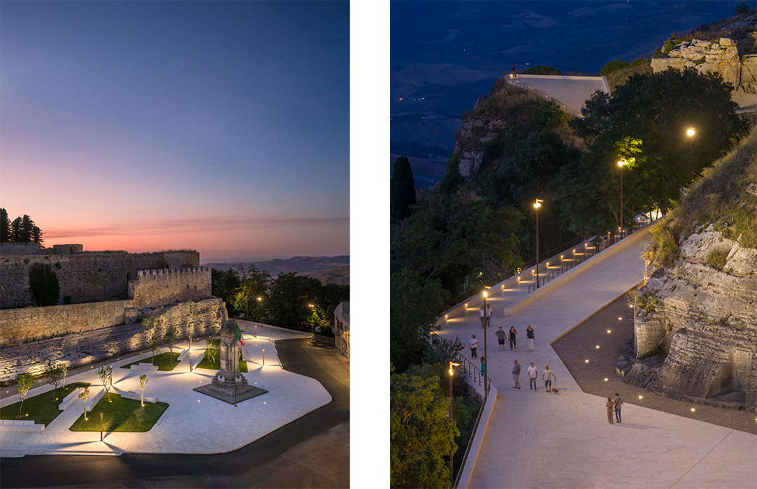 Finalmente, el camino que conecta Piazzale Euno con la Rocca di Cerere se resolvió con balizas SPY, dotadas de un acabado en vidrio blanco. Estas discretas luminarias, integradas directamente en el muro existente, emiten un resplandor tenue y uniforme que guía el paso de los peatones garantizando seguridad y confort visual, al tiempo que preserva la atmósfera natural del entorno histórico.