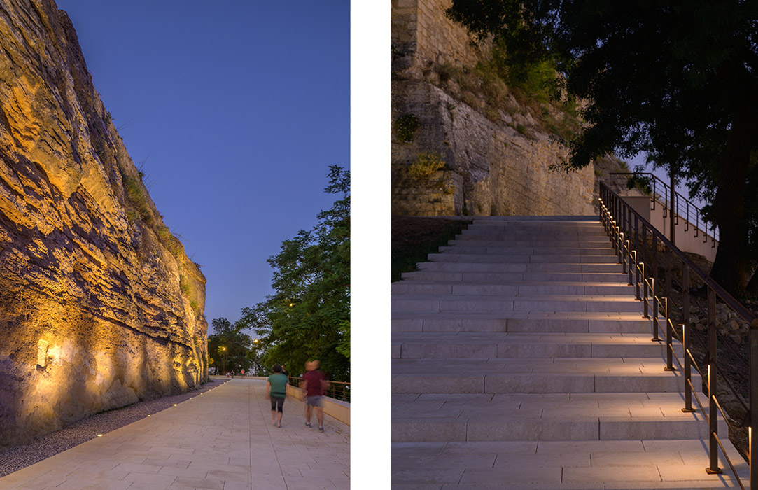 La escarpa rocosa situada al pie del castillo, un elemento de gran valor paisajístico, se destacó mediante luminarias empotradas en el suelo del modelo MEDIO, dispuestas a lo largo de la franja de grava. Su instalación a ras de terreno permite resaltar el relieve natural sin alterar la composición visual del paisaje.