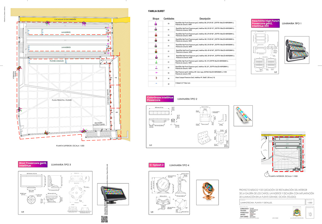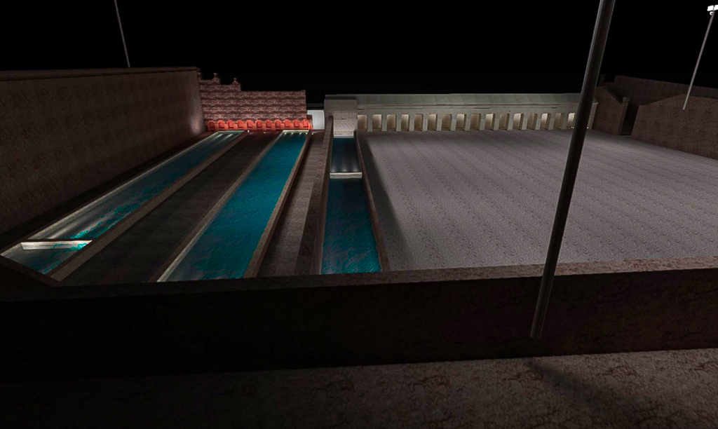 Asimismo, los lavaderos y abrevaderos contarán con una iluminación subacuática que potencie la lectura hidráulica del Monumento, introduciendo un toque de teatralidad novedoso. Finalmente, la explanada contará con una iluminación de carácter modificable para adaptarse a los horarios, estaciones climatológicas e incluso conmemoraciones señaladas (p. e. proyectando colores símbolos de determinadas celebraciones).