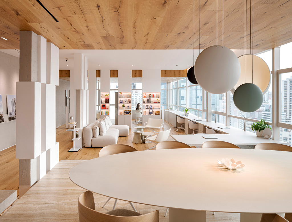 En conjunto, la composición se apoya en una combinación de líneas rectas en la arquitectura —inspiradas en las fachadas de los desarrollos inmobiliarios de la firma— con formas más suaves en el mobiliario y las luminarias. Esta dualidad, junto a una paleta de tonos neutros y materiales naturales, contribuye a una percepción equilibrada del espacio, donde la luz se distribuye de forma homogénea y refuerza una atmósfera cálida, sin perder claridad funcional.
