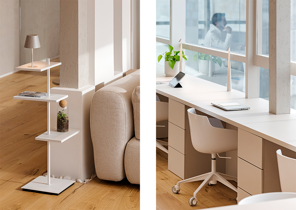 A lo largo de la fachada acristalada, un escritorio longitudinal reúne varios puestos de trabajo, acompañados por luminarias de sobremesa de la colección Africa, diseñadas por Francisco Gómez Paz. Su carácter portátil y recargable aporta flexibilidad en la iluminación de tarea, adaptándose a las necesidades del usuario en un entorno de trabajo abierto.