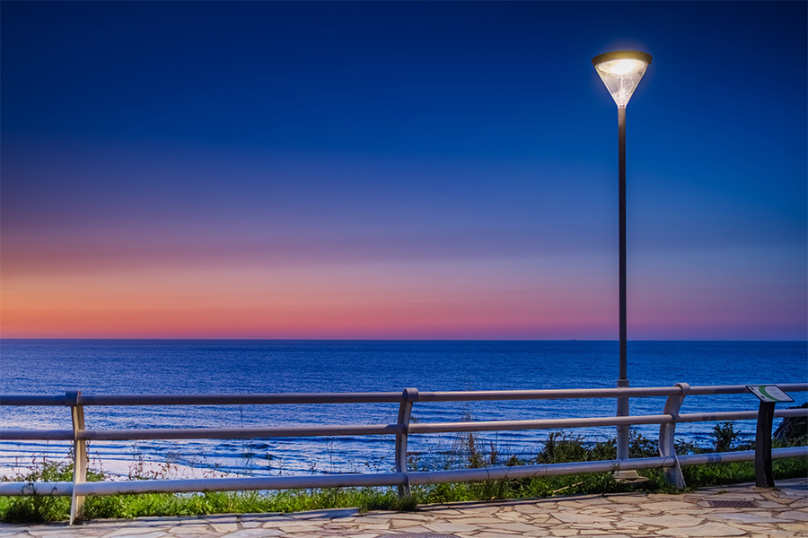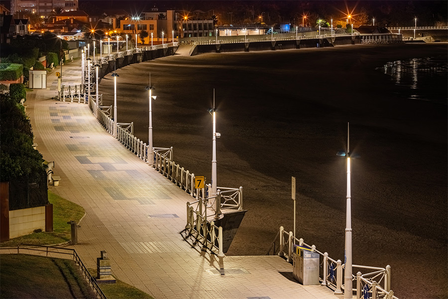 Para cumplir con los objetivos se ha incorporado la luminaria Evolución P, equipada con óptica asimétrica y control de flujo, capaz de concentrar la luz exclusivamente sobre el paseo y reducir la potencia instalada en más de un 75 %. El color de luz elegido, 3000 K, mejora el confort visual y se integra de manera natural en el paisaje marino, mientras que la distribución homogénea garantiza seguridad, uniformidad y una experiencia nocturna más agradable.
