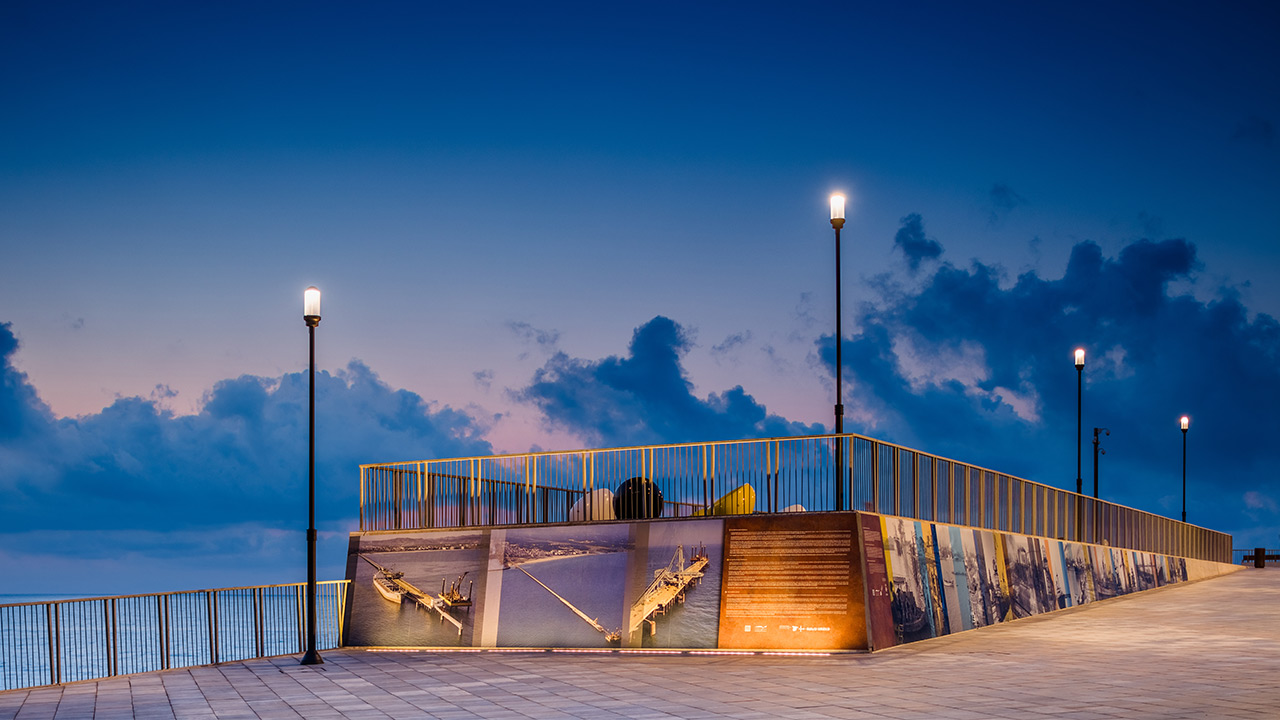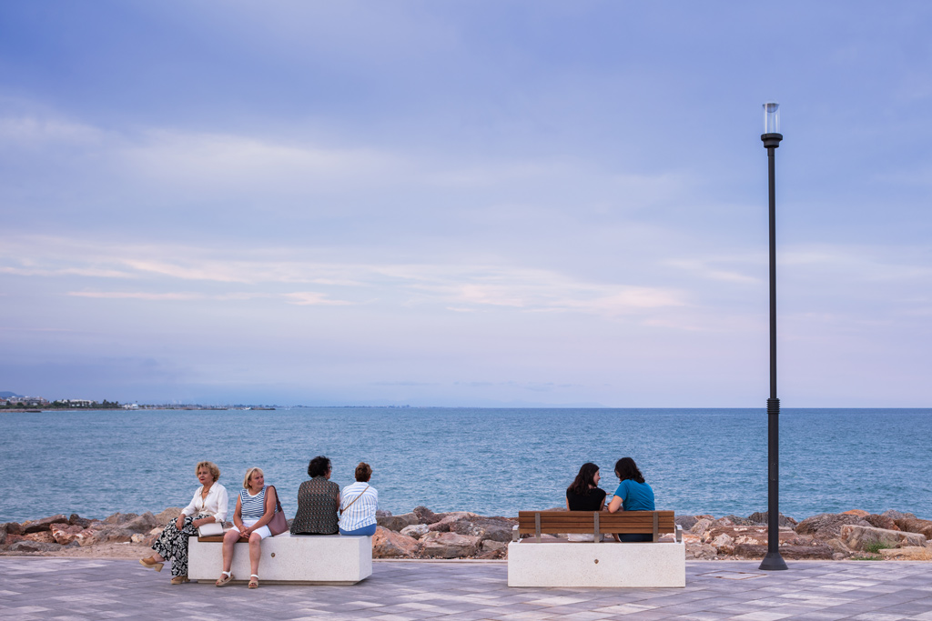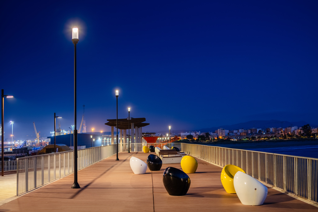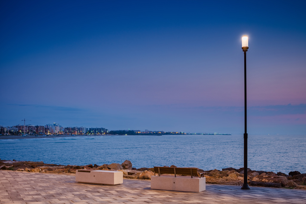 Para el nuevo paseo marítimo se instalaron conjuntos completos ATP, formados por luminarias Alfa 2A con Difusor Confort® y columnas Coliseo de polímero técnico con núcleo de acero (Tubo Sinérgico Clase II+ antielectrocución).