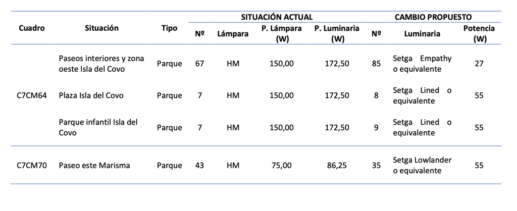 A partir del estudio lumínico realizado, se han seleccionado tres modelos de luminaria con distribuciones fotométricas adaptadas, que se instalarán sobre báculos existentes o de nueva implantación según cada caso. En la siguiente tabla puede ver en número de puntos de luz a renovar y la solución propuesta en el proyecto de ejecución: