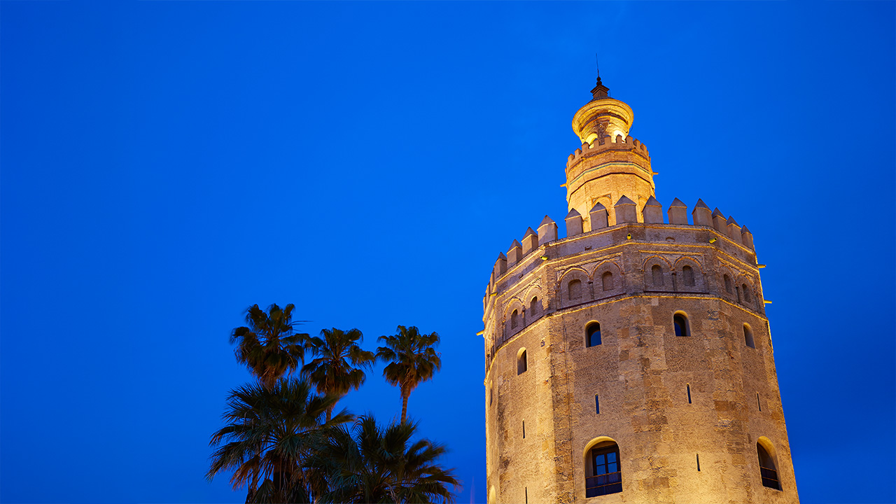 La Torre del Oro, situada a orillas del Guadalquivir en el barrio del Arenal, es una de las construcciones defensivas más emblemáticas del casco histórico de Sevilla. Se trata de una torre albarrana formada por tres cuerpos diferenciados: un primer cuerpo dodecagonal de tapial reforzado con sillares, un segundo cuerpo de ladrillo macizo rematado con almenas y una linterna cilíndrica superior coronada por una cúpula revestida con azulejo en tonos albero, añadida en el siglo XVIII. Su singular volumetría y su posición junto al río convierten al monumento en un referente visual clave del paisaje nocturno de la ciudad.