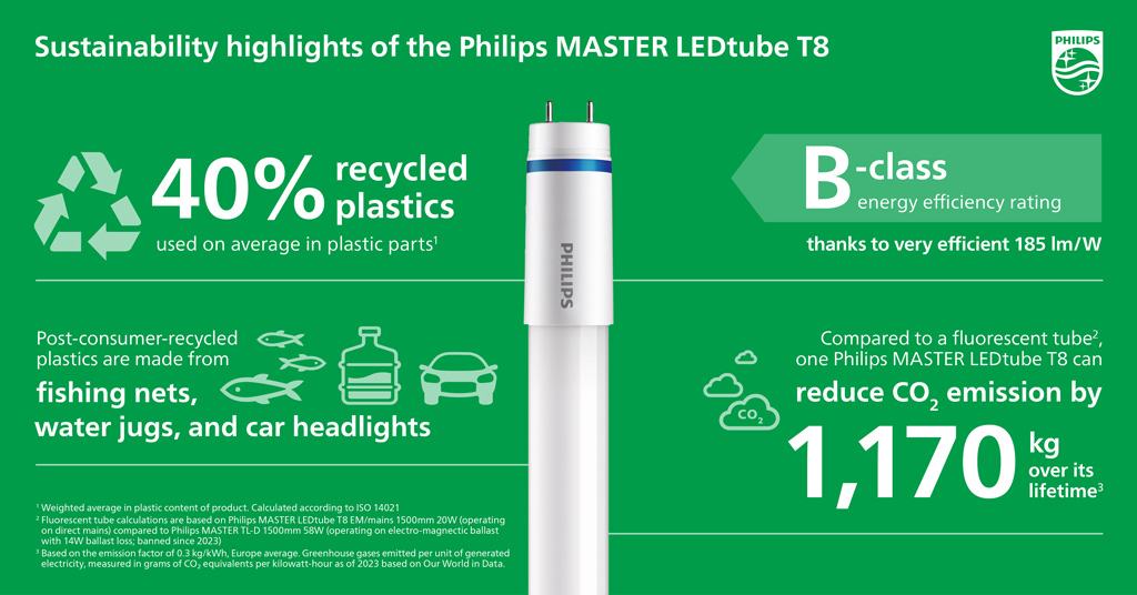En el caso del tubo Philips MASTER LEDtube T8, el material PCR empleado procede de fuentes tan diversas como redes de pesca desechadas, garrafas de agua y componentes plásticos de automóviles, como faros. A modo de referencia, la instalación de 1.000 unidades de estos tubos LED implica la reutilización de una cantidad de plástico equivalente al peso de 2.500 botellas de PET de medio litro.