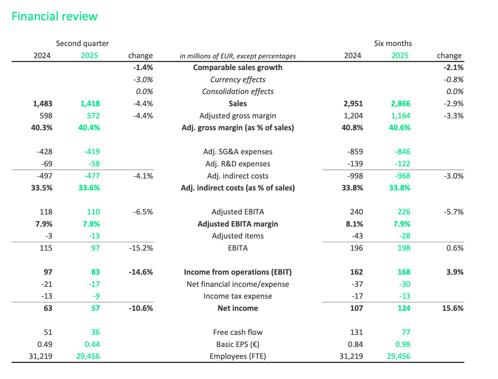 Durante el trimestre, los costes de reestructuración ascendieron a 10 millones de euros. Los cargos relacionados con adquisiciones aportaron un beneficio de 1 millón, mientras que otros elementos extraordinarios tuvieron un impacto negativo de 3 millones, frente a un efecto positivo de 8 millones en el segundo trimestre de 2024.