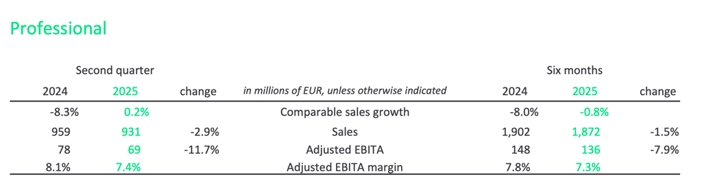 En términos de ventas comparables —que excluyen efectos cambiarios y adquisiciones— el descenso ha sido más contenido, del 1,4 %, impulsado por el crecimiento tanto del segmento profesional como del doméstico. Sin embargo, el retroceso del negocio convencional sigue lastrando el conjunto.
