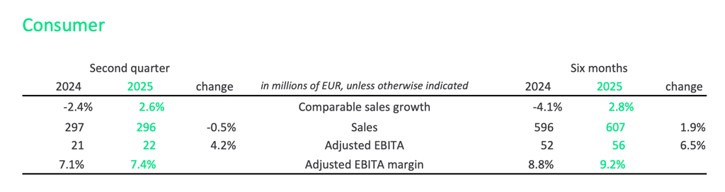 Sin embargo, las ventas comparables crecieron un 2,6 %, reflejando la buena dinámica del negocio de consumo en la mayoría de los mercados. El segmento mantuvo un sólido rendimiento, especialmente en la gama de productos para el hogar conectado. El margen EBITA ajustado mejoró en 30 puntos básicos, hasta alcanzar el 7,4 %, impulsado principalmente por el aumento del volumen de ventas.