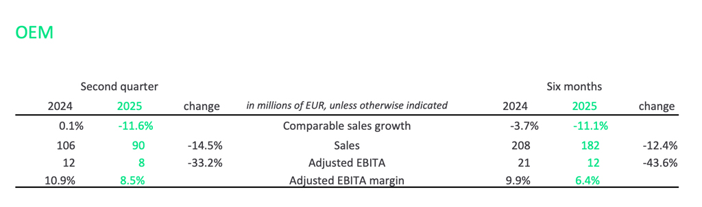 En relación con el negocio de OEM, las ventas nominales se redujeron un 14,5 % en el trimestre, hasta los 90 millones de euros, afectadas por un impacto negativo del 2,9 % debido al tipo de cambio.