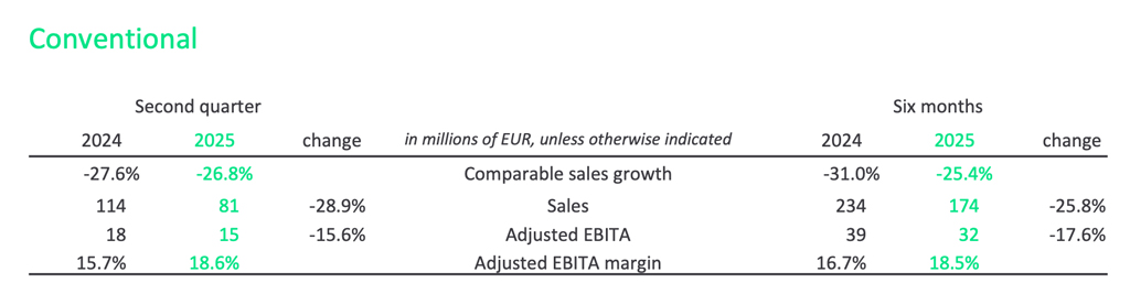 Las ventas comparables disminuyeron un 26,8%, reflejando el declive estructural del negocio. El margen EBITA ajustado mejoró 290 puntos básicos hasta el 18,6%, impulsado principalmente por la expansión del margen bruto gracias a una disciplinada gestión de precios y costes.